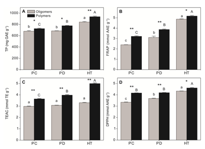 在抗氧化活性測試中,研究采用了Folin-Ciocalteu、FRAP、TEAC和DPPH四種方法,結果顯示HT的抗氧化能力最強,其次是PD和PC,且聚合體的抗氧化活性普遍高于寡聚體(圖2)。這主要歸因于結構中對苯二酚和兒茶酚型羥基的數量和位置,HT因富含GA而具有更多的羥基,從而表現出更強的抗氧化活性(圖1)。