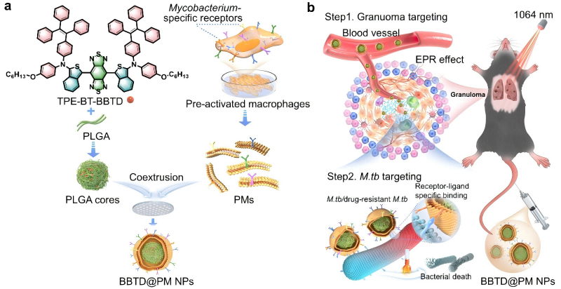 圖1 (a)仿生靶向納米BBTD@PM NPs的制備過程簡圖;(b)BBTD@PM NPs用于小鼠活體肺結核一體化診療示意圖。