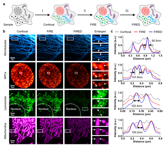 實驗結果表明,FIRED技術能將普通共聚焦顯微鏡的橫向分辨率提升約4倍(例如,熒光微球樣品中從298.0 nm提升至71.2 nm),圖像信背比(SBR)也顯著提高。該技術兼容普通熒光染料,所需激光功率密度極低(~1.72 kW/cm2,比STED低3-4個數量級),光毒性小,并保留了共聚焦的光學層切能力。FIRED技術在固定細胞和活細胞的多種細胞器(微管、核孔復合體、溶酶體、線粒體)中均得到驗證,展現出優異的通用性(圖2)。該技術操作簡便、硬件改動小、成本低、光損傷小的特點,為生物醫學和材料科學領域,特別是活細胞長時程、多結構的超分辨動態研究,提供了一個經濟高效且易普及的技術平臺。