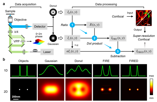 遠場光學顯微鏡是揭示生物分子結構與動態的重要工具,但受限于光學衍射極限。該研究創新性地提出了熒光強度比率編碼與差分(FIRED)超分辨成像技術。該方法基于傳統共聚焦系統,僅需簡單升級增加環形光路,利用相同波長的高斯光束與環形光束分別激發樣本,獲取兩幅圖像。通過對圖像像素強度進行特定比率運算生成權重矩陣,并應用于原始圖像進行編碼,再結合差分處理,有效突破衍射極限(圖1)。